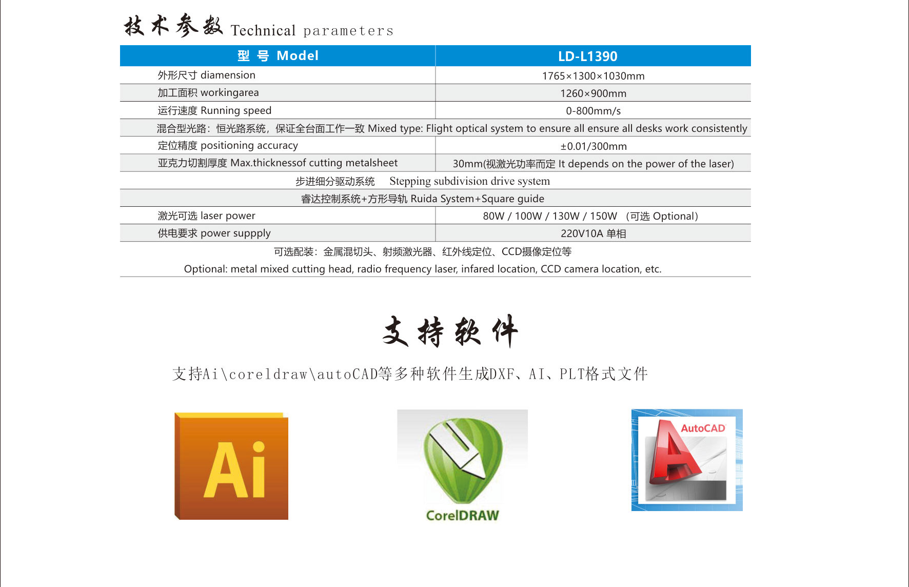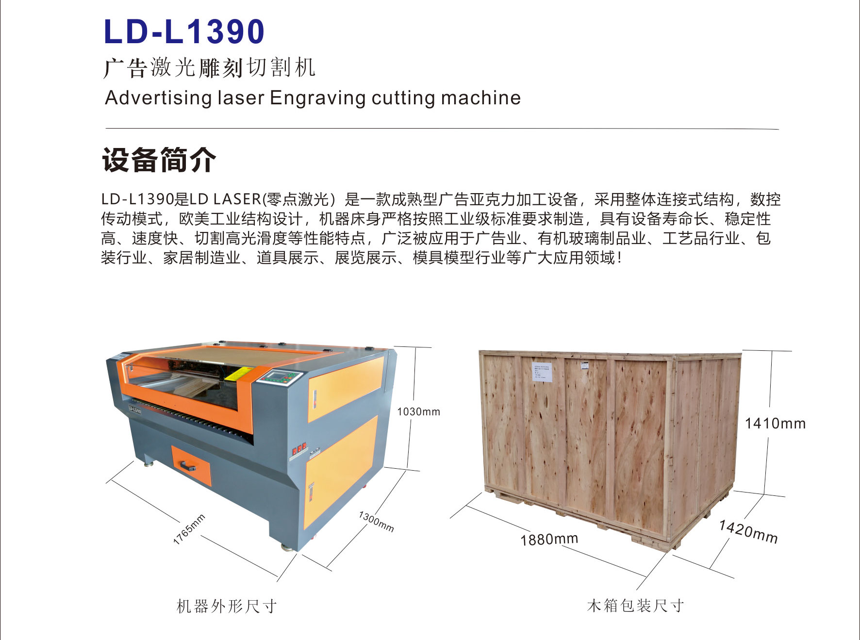 LD-L1390是LD Laser(零點(diǎn)激光)一款成熟型廣告亞克力加工設(shè)備,采用整體連接式結(jié)構(gòu),數(shù)控傳動(dòng)模式,歐美工業(yè)結(jié)構(gòu)設(shè)計(jì),機(jī)器床身嚴(yán)格按照工業(yè)級(jí)標(biāo)準(zhǔn)要求制造,具有設(shè)備壽命長、穩(wěn)定性高、速度快、切割效果好等性能特點(diǎn),被廣泛應(yīng)用于廣告行業(yè)、有機(jī)玻璃制造業(yè)、工藝品行業(yè)、包裝行業(yè)、家具制造業(yè)、道具展示、展覽展示、模型摸具行業(yè)、服裝制造業(yè)等廣大應(yīng)用領(lǐng)域。